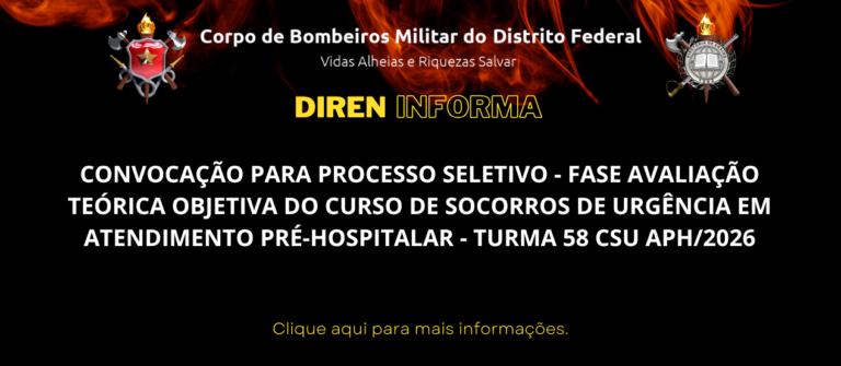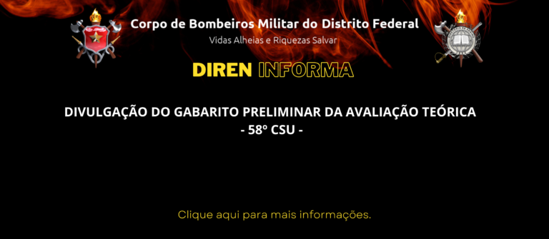 GABARITO PRELIMINAR DA AVALIAÇÃO TEÓRICA – 58º CSU O DIRETOR DE ENSINO torna público o Gabarito Preliminar da avaliação teórica – CSU Turma 58., conforme segue: Conforme EDITAL N° 7/2026 – CBMDF/DIREN/SEITC, publicado no Boletim Geral n° 013, de…